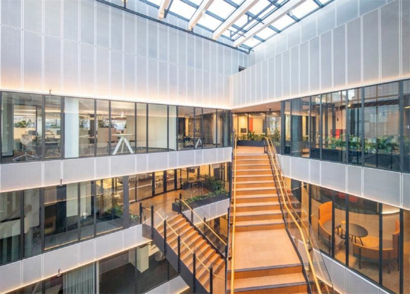 軟木樓梯將同樣鋪設軟木地板的辦公區相連接,充分發揮軟木吸音降噪的特質,帶來安靜舒適的辦公新體驗。搭配明麗的座椅燈具卻毫不違和,反而增添了靈動性與活力。